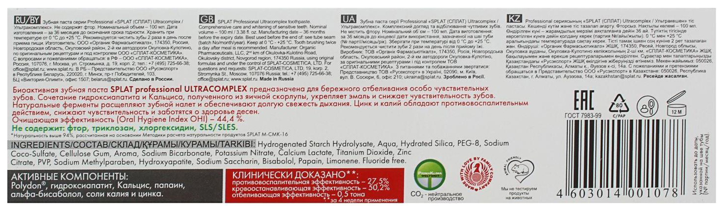 • Состав набора SPLAT Зубная паста Professional Ультракомплекс 100мл