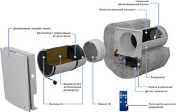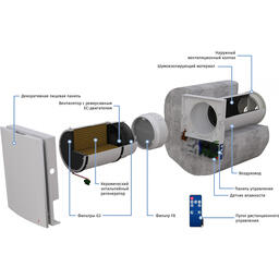 Комплектациявнутренняя крышка с приводом заслонки, воздушный фильтр G3, панель управления, пульт ду