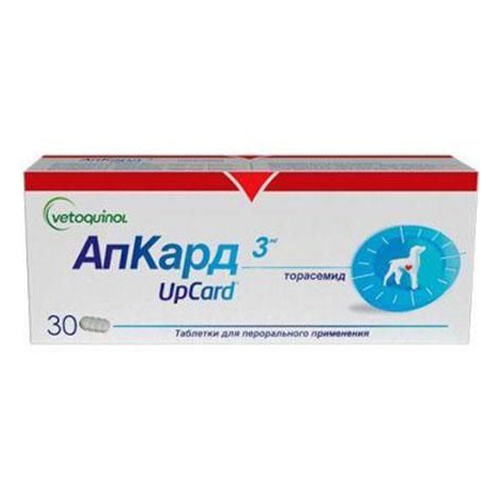 Таблетки АпКард применяют индивидуально, перорально, независимо от режима кормления, можно давать с пищей или без нее. Рекомендуемая доза торасемида составляет от 0,1 до 0,6 мг на 1 кг массы тела один раз в сутки.