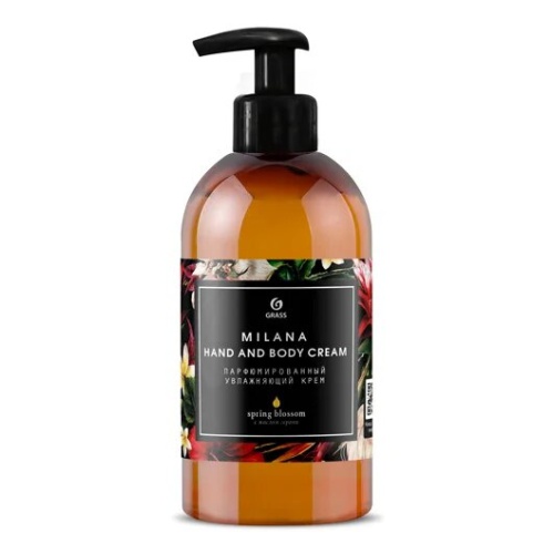 Крем для рук и тела MILANA Hand and Body Cream Spring Blossom Увлажняющий, парфюмированный, 300 млMILANA HAND AND BODY CREAM – линейка парфюмированных кремов от Grass. Идеально сочетается с парфюмированным жидким мылом Milana (Spring Bloom, Oud Rood, Green Stalk). Легкая текстура кремов позволяет им быстро впитываться и увлажнять кожу, придавая ей шелковистость и ухоженный вид, не оставляя ощущения жирности и пленки.Обеспечивают питание и восстановление благодаря растительным маслам — карите (ши), виноградных косточек, канолы, а также витамину Е и пантенолу в составе.Обладают уникальными свойствами за счет эфирных масел: кедра атласского, лаванды и герани.Подходят для ежедневного применения, массажа рук и SPA-ухода.Удобный формат продукта обеспечивает экономичный расход и легкость использования кремов.Парфюмированные композиции разработаны специально для нашей новой линейки. Аромат придает неповторимый шарм, поднимает настроение и дарит наслаждение.