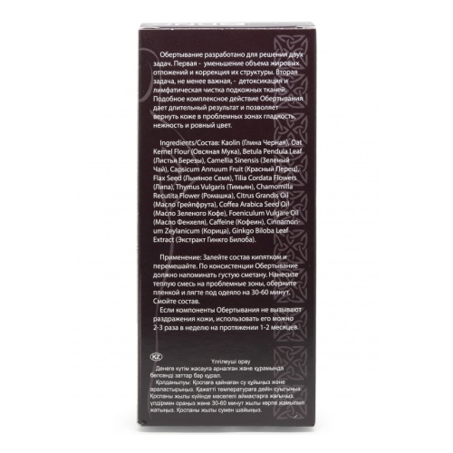 Применение: Залейте состав кипятком и перемешайте. По консистенции Обертывание должно напоминать густую сметану. Нанесите теплую смесь на проблемные зоны, оберните пленкой и лягте под одеяло на 30-60 минут. Смойте состав.Если компоненты Обертывания не вызывают раздражения кожи, использовать его можно 2-3 раза в неделю на протяжении 1-2 месяцев.Состав: Kaolin (Глина Черная), Oat Kernel Flour (Овсяная Мука), Betula Pendula Leaf (Листья Березы), Camellia Sinensis (Зеленый Чай), Capsicum Annuum Fruit (Красный Перец), Flax Seed (Льняное Семя), Tilia Cordata Flowers (Липа), Thymus Vulgaris (Тимьян), Chamomilla Recutita Flower (Ромашка), Citrus Grandis Oil (Масло Грейпфрута), Coffea Arabica Seed Oil (Масло Зеленого Кофе), Foeniculum Vulgare Oil (Масло Фенхеля), Caffeine (Кофеин), Cinnamonum Zeylanicum (Корица), Ginkgo Biloba Leaf Extract (Экстракт Гинкго Билоба).