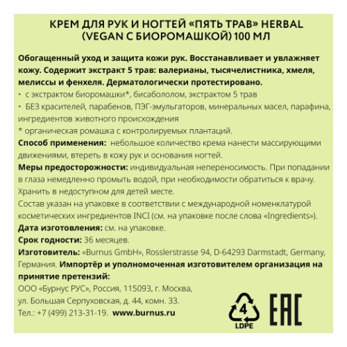 Крем для рук и ногтей KAMILL Intensiv, 100 млИнтенсивный уход, защита и восстановление сухой кожи рук. Глубоко питает, увлажняет поврежденную и огрубевшую кожу, избавляет от шелушений. Защищает и регенерирует. Прекрасно подходит для ночного ухода и ухода за руками в холодное время года. Дерматологически протестировано.- с экстрактом биоромашки* и бисабололом, с алоэ вера и маслом авокадо- БЕЗ красителей, парабенов, ПЭГ-эмульгаторов, минеральных масел, парафина, ингредиентов животного происхождения*органическая ромашка с контролируемых плантаций
