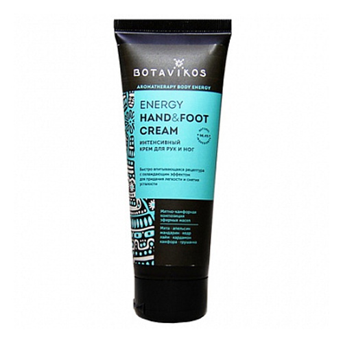 Крем для рук и ног BOTAVIKOS Aromatherapy Energy Интенсивный, 75 млСоздан для направленного ухода за кожей рук и ног. Благодаря активным природным компонентам, входящим в его формулу, крем интенсивно питает, облегчает чувство тяжести и усталости, имеет приятную пудровую текстуру, легко наносится и идеально впитывается.Масло авокадо – источник редкой пальмитолеиновой жирной кислоты и витаминов A, E, D, питает, увлажняет кожу, придает ей гладкость и тонус. Масла ши и какао с высоким содержанием олеиновой и стеариновой жирных кислот разглаживают рельеф, смягчают, уменьшают шелушение и сухость. D-пантенол или провитамин В5 увлажняет кожу и стимулирует противовоспалительные процессы. Экстракт розмарина обладает выраженными антисептическими свойствами, великолепно тонизирует и освежает. Витамины, дубильные вещества и эфирные масла в составе экстракта зверобоя определяют его способность бороться с бактериями и заживлять повреждения кожи. Канделильский воск, получаемый из кустарника канделилла, оберегает кожу от внешних воздействий, формируя невесомую защитную пленочку на ее поверхности.Ментол и энергичная жизнерадостная мятно-камфорная композиция эфирных масел создают охлаждающий эффект, придающий ощущение легкости и комфорта.