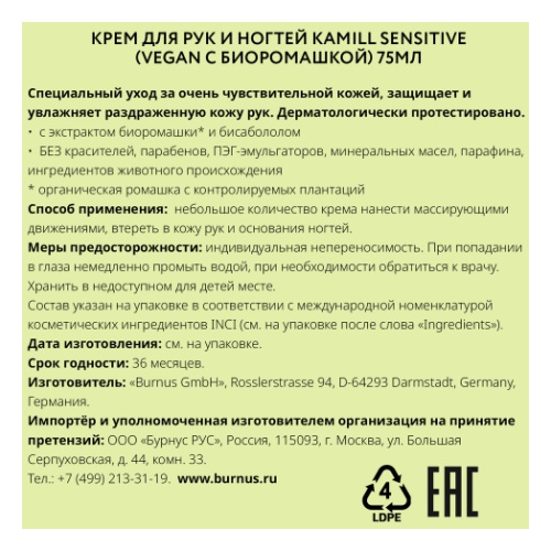 Крем для рук и ногтей KAMILL Sensitive, 75 млСпециальный уход за чувствительной кожей. Защищает и увлажняет раздраженную кожу рук. Дерматологически протестировано.- с экстрактом биоромашки* и бисабололом- БЕЗ красителей, парабенов, ПЭГ-эмульгаторов, минеральных масел, парафина, ингредиентов животного происхождения*органическая ромашка с контролируемых плантаций