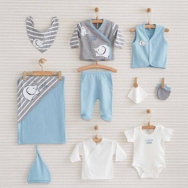 - В комплекте распашонка, ползунки, боди, рукавички, кофточка, слюнявчик, шапочка, плед, жилетка, платочек
