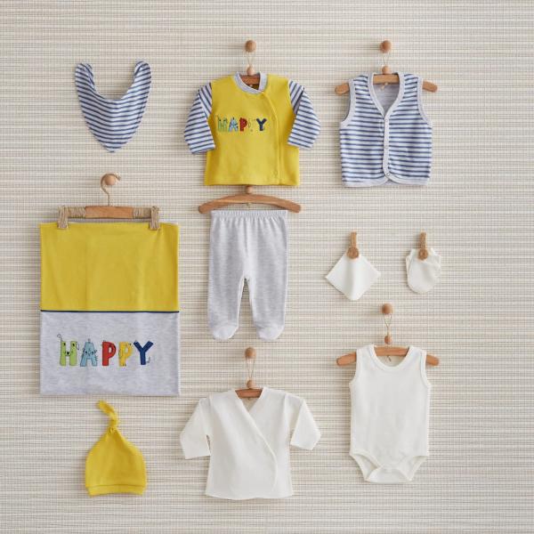 - В комплекте распашонка, ползунки, боди, рукавички, кофточка, слюнявчик, шапочка, плед, жилетка, платочек