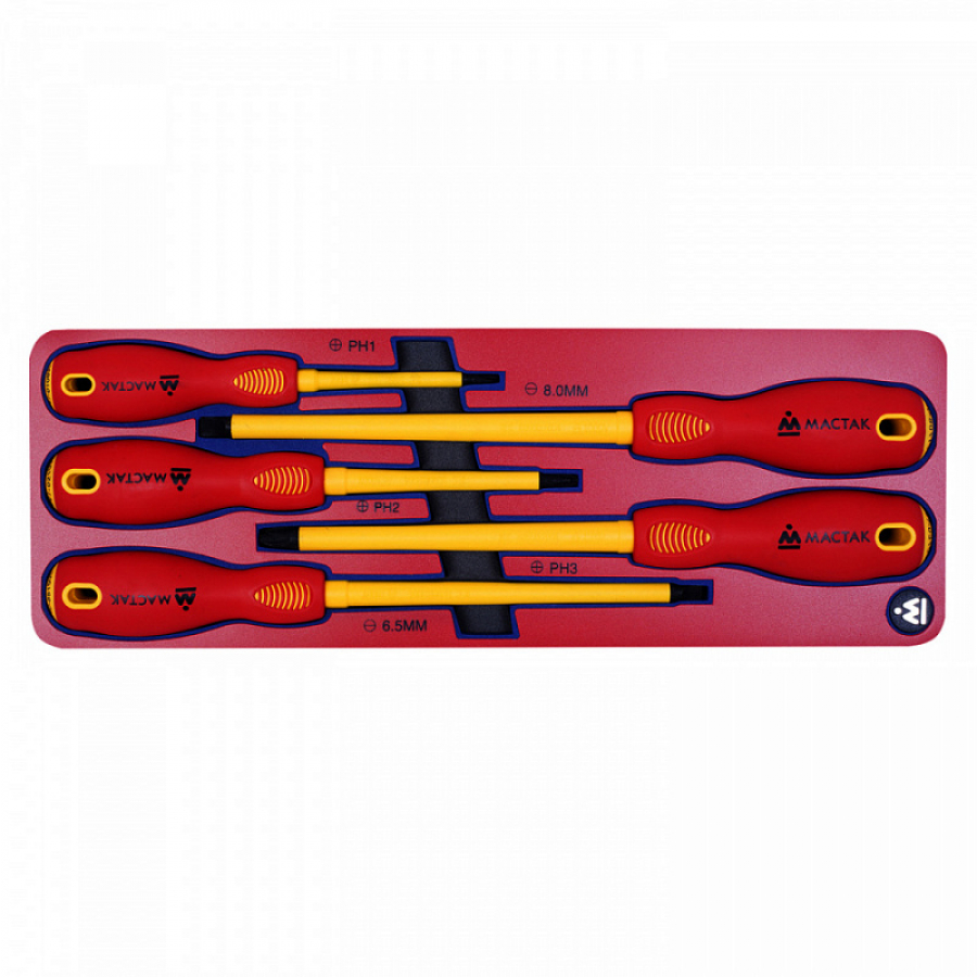 - Комплект поставки Отвертки шлицевые: 6.5х100, 8х175 мм, Отвертки крестовые: 1х80, 2х100, 3х150 мм, Ложемент.