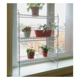 Размер стеллажа (ДхГхВ): 620х330х930 мм.Прочность:Изготовлен из высококачественной стальной проволоки с порошково-полимерным покрытием.Эстетика:Стеллаж для рассады «Найди» в белом цвете выглядит аккуратно, легко и не выделяется на фоне комнаты.Компактная упаковка:Упакован в коробку 920х295х85 мм из гофр картона в разобранном виде.Для торговых сетей коробки удобны для размещения на полках.Простота сборки:Конструкция легко собирается и разбирается. Инструмент не требуется. В комплект входит инструкция.Мобильность:Можно регулировать высоту полок. Стеллаж не тяжелый, легко переместить с пола на подоконник, из одной комнаты в другую.Универсальный:Когда рассада будет высажена в грунт, стеллаж можно использовать для хранения банок, заготовок или как поставку для цветов.Либо убрать в коробку, в которой он продавался. Материал:Высококачественная стальная проволока.