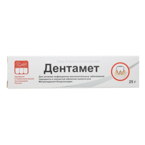 СоставМетронидазол – 1,00 г,хлоргексидин глюконата 20% – 0,50 г,вспомогательные вещества.Активные компонентыЭффективность препарата обусловлена наличием в его составе двух антибактериальных компонентов:а) метронидазол обладает антибактериальным действием против анаэробных бактерий, вызывающих заболевания пародонта: Porphyromonas gingivalis, Prevotella intermedia, Fusobacterium fusiformis, Wolinella recta, Eikenella corrodens, Borellia vincenti, Bacteroides melaninogenicus, Selenomonas spp.;б) хлоргексидин – антисептик широкого спектра, обладающий бактерицидным действием в отношении вегетативных форм грамотрицательных и грамположительных микроорганизмов, а также дрожжей, дерматитов и липофильных вирусов.При местном применении гель Дентамет практически не всасывается.ПоказанияИнфекционно-воспалительные заболевания пародонта и слизистой оболочки полости рта: острый и хронический гингивит (воспаление десен);острый язвенно-некротический язвенный гингивит Винцента;хронический отечный гингивит, хронический гиперпластический гингивит, хронический атрофический (десквамативный) гингивит;острый и хронический пародонтит;пародонтоз, осложненный воспалением;язвенный, афтозный стоматит;гангренозный пульпит;хейлит;воспаления слизистой оболочки полости рта при ношении протезов;воспаления лунки после удаления зуба;зубная боль инфекционного происхождения;периодонтит, периодонтальный абсцесс (в составе комплексной терапии);постэкстракционный альвеолит, юношеский пародонтит.ПротивопоказанияПовышенная чувствительность, индивидуальная непереносимость компонентов.Детский возраст до 6 лет. Побочные действия"Металлический" привкус во рту, головная боль, аллергические реакции (кожная сыпь, зуд, крапивница).ВзаимодействиеПри местном применении в рекомендованных дозах системного взаимодействия геля Дентамет с другими лекарственными средствами не выявлено.Как принимать, курс приема и дозировкаТолько для стоматологического применения!Взрослым и детям старше 6 лет – при воспалении десен (гингивит).Наносится на область десен 2 раза в день.Не смывать, воздерживаться от питья, еды, чистки зубов.Длительность курса лечения – 7-10 дней.Не заменяет чистку зубов.Профилактические курсы лечения проводятся в течение 2-4 нед. 1-2 раза в год.ПередозировкаСлучаев передозировки препарата при местном применении не наблюдалось.Специальные указанияПрименение геля Дентамет не заменяет гигиенической чистки зубов, поэтому во время курса лечения препаратом чистка должна быть продолжена.Форма выпускаГель, 25 г, туба.Действующее веществоМетронидазол, ХлоргексидинУсловия отпуска из аптекБез рецепта