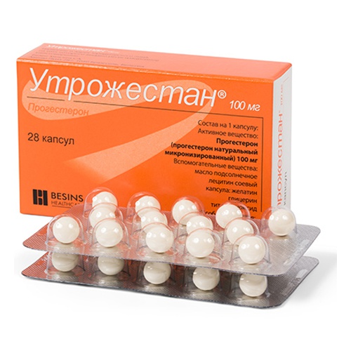 Лекарственная форма Круглые, мягкие блестящие желатиновые капсулы желтоватого цвета, содержащие масляную беловатую гомогенную суспензию (без видимого разделения фаз). Состав на 1 капсулу: Действующее вещество: прогестерон натуральный микронизированный 100 мг Вспомогательные вещества: подсолнечное масло 149 мг, лецитин соевый 1 мг; капсула - желатин 76.88 мг, глицерин 31.45 мг, титана диоксид 1.67 мг Фармакодинамика Действующим веществом препарата Утрожестан® является прогестерон, идентичный естественному гормону желтого тела яичника. Связываясь с рецепторами на поверхности клеток органов-мишеней, проникает в ядро, где, активируя ДНК, стимулирует синтез РНК. Способствует переходу слизистой оболочки матки из фазы пролиферации, вызываемой фолликулярным гормоном эстрадиолом, в секреторную фазу, а после оплодотворения - в состояние, необходимое для развития оплодотворенной яйцеклетки. Уменьшает возбудимость и сократимость мускулатуры матки и маточных труб. Способствует образованию нормального эндометрия. Стимулирует развитие концевых элементов молочной железы и индуцирует лактацию. Стимулируя протеинлипазу, увеличивает запасы жира; повышает утилизацию глюкозы; увеличивая концентрацию базального и стимулированного инсулина, способствует накоплению в печени гликогена; повышает выработку гонадотропных гормонов гипофиза; уменьшает азотемию, увеличивает выведение азота почками. Фармакокинетика При приеме внутрь Всасывание Микронизированный прогестерон хорошо всасывается в желудочно-кишечном тракте (ЖКТ). Концентрация прогестерона в плазме крови постепенно повышается в течение первого часа, максимальная концентрация в плазме крови (Сmax) отмечается через 1-3 ч после приема. Концентрация прогестерона в плазме крови увеличивается от 0,13 нг/мл до 4,25 нг/мл через 1 ч, до 11,75 нг/мл через 2 ч и составляет 8,37 нг/мл через 3 ч, 2 нг/мл через 6 ч и 1,64 нг/мл через 8 ч после приема. Метаболизм Основными метаболитами, которые определяются в плазме крови, являются 20-альфа- гидрокси-дельта-4-альфа-прегнанолон и 5-альфа-дигидропрогестерон. Выведение Выводится почками в виде метаболитов, 95% из них составляют глюкуронконъюгированные метаболиты, в основном 3-альфа, 5-бета-прегнандиол (прегнандион). Указанные метаболиты, которые определяются в плазме крови и в моче, аналогичны веществам, образующимся при физиологической секреции желтого тела. При вагинальном введении Всасывание и распределение Абсорбция происходит быстро, высокая концентрация прогестерона в плазме крови наблюдается через 1 час после введения. Сmах прогестерона в плазме крови достигается через 2-6 ч после введения. При введении 100 мг 2 раза в сутки средняя концентрация в плазме крови сохраняется на уровне 9,7 нг/мл в течение 24 ч. При введении в дозах более 200 мг/сут, концентрация прогестерона соответствует I триместру беременности. Связь с белками плазмы - 90%. Прогестерон накапливается в матке. Метаболизм Метаболизируется с образованием преимущественно 3-альфа, 5-бета-прегнандиола. Концентрация 5-бета-прегнанолона в плазме крови не увеличивается. Выведение Выводится почками в виде метаболитов, основную часть составляет 3-альфа, 5-бета- прегнандиол (прегнандион). Это подтверждается постоянным повышением его концентрации (Сmах 142 нг/мл через 6 ч). Побочные действия Перечисленные ниже нежелательны