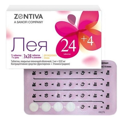 Лекарственная форма Описание Круглые, двояковыпуклые таблетки, покрытые пленочной оболочкой розового цвета. Таблетки плацебо: круглые, двояковыпуклые таблетки, покрытые пленочной оболочкой белого цвета. Состав 24 таблетки розового цвета, покрытые пленочной оболочкой. Каждая таблетка содержит: Активные вещества: дроспиренон - 3 мг, этинилэстрадиол - 0,02 мг. Вспомогательные вещества : ядро: лактозы моногидрат - 68,18 мг, полакрилин калия – 4,0 мг, повидон-K30 - 4,0 мг, магния стеарат – 0,80 мг; пленочная оболочка: Опадрай II Розовый 85F34048 (Макрогол 3350 – 0,404 мг, титана диоксид – 0,496 мг, поливиниловый спирт – 0,8 мг, тальк – 0,296 мг, краситель железа оксид красный – 0,0036 мг, краситель железа оксид желтый – 0,0004 мг) – 2,0 мг. 4 таблетки белого цвета, покрытые пленочной оболочкой (плацебо) Активные вещества: не содержат.Вспомогательные вещества: ядро: лактозы моногидрат – 73,4 мг, полакрилин калия – 1,6 мг, повидон-K30 - 4,00 мг, кремния диоксид коллоидный – 0,2 мг, магния стеарат – 0,80 мг; пленочная оболочка: Опадрай II белый 85F18422 (Макрогол 3350 – 0,8 мг, титана диоксид – 0,5 мг, поливиниловый спирт – 0,404 мг, тальк – 0,296 мг) – 2,0 мг. Фармакодинамика Препарат Лея - монофазный комбинированный пероральный контрацептив (КОК), в состав которого входит этинилэстрадиол и прогестаген дроспиренон. Контрацептивный эффект препарата Лея основан на взаимодействии различных факторов, из которых наиболее важными являются подавление овуляции и изменение свойств цервикального секрета, в результате чего он становится малопроницаемым для сперматозоидов. В терапевтических дозах дроспиренон обладает также антиандрогенным и умеренным антиминералокортикоидным свойствами, что придает дроспиренону фармакологический профиль, сходный с профилем природного прогестерона. Дроспиренон способствует уменьшению симптомов акне (угрей), жирности кожи и волос, предупреждает увеличение массы тела и появление отеков, связанных с вызываемой эстрогенами задержкой жидкости, что обеспечивает очень хорошую переносимость препарата Лея. Показано положительное воздействие и клиническая эффективность дроспиренона в облегчении симптомов тяжелой формы предменструального синдрома (ПМС), таких как выраженные психоэмоциональные нарушения, нагрубание молочных желез, головная боль, боль в мышцах и суставах, увеличение массы тела и другие симптомы, ассоциированные с менструальным циклом. В сочетании с этинилэстрадиолом, дроспиренон демонстрирует благоприятный эффект на липидный профиль, характеризующийся повышением содержания липопротеидов высокой плотности (ЛПВП) в плазме крови. У женщин, принимающих КОК, менструальный цикл становится более регулярным, реже наблюдаются болезненные менструации, уменьшается интенсивность кровотечения, что снижает риск развития анемии. Кроме того, по данным эпидемиологических исследований, при применении КОК снижается риск развития рака эндометрия и рака яичников. Фармакокинетика Дроспиренон Абсорбция При пероральном приеме дроспиренон быстро и почти полностью абсорбируется. После однократного приёма внутрь максимальная концентрация в плазме крови, равная около 38 нг/мл, достигается примерно через 1 - 2 ч. Биодоступность составляет 76 - 85%. Прием пищи не влияет на биодоступность дроспиренона. Распределение После перорального приема концентрация дроспиренона в плаз