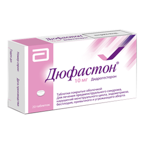 Лекарственная форма Круглая двояковыпуклая таблетка белого цвета, со скошенными краями, покрытая оболочкой, с риской на одной стороне, с гравировкой «155» с обеих сторон от риски. Состав В 1 таблетке покрытой оболочкой содержится: Активное вещество: дидрогестерон - 10 мг. Вспомогательные вещества: лактозы моногидрат - 111,1 мг, гипромеллоза - 2,8 мг, крахмал кукурузный - 14,0 мг, кремния диоксид коллоидный - 1,4 мг, магния стеарат -0,7 мг. Оболочка: опадри белый Y-1-7000 [гипромеллоза, полиэтиленгликоль 400, титана диоксид (Е171)] -4,0 мг. Фармакодинамика Дюфастон® (дидрогестерон) - это прогестаген, активный при приеме внутрь и показанный во всех случаях эндогенной недостаточности прогестерона. Дидрогестерон обеспечивает наступление фазы секреции в эндометрии, тем самым снижая риск гиперплазии эндометрия и/или канцерогенеза, индуцированного эстрогенами. Не обладает эстрогенной, андрогенной, анаболической и глюкокортикостероидной активностью. Дидрогестерон не является контрацептивом. Терапевтический эффект на фоне приема дидрогестерона достигается без подавления овуляции. Фармакокинетика Всасывание После приема внутрь дидрогестерон быстро всасывается. Время достижения максимальной концентрации для дидрогестерона варьируются между 0,5 и 2,5 ч. Абсолютная биодоступность дидрогестерона (доза 20 мг для приема внутрь по сравнению с внутривенным введением 7,8 мг) составляет 28 %. Распределение После внутривенного введения дидрогестерона объем распределения в состоянии равновесия составляет около 1400 л. Более 90% дидрогестерона и ДГД связывается с белками плазмы крови. Метаболизм После приема внутрь дидрогестерон быстро метаболизируется до ДГД. Сmах основного метаболита ДГД достигается примерно спустя 1,5 часа после приема препарата. Концентрация ДГД в плазме крови значительно выше концентрации дидрогестерона. Соотношения AUC и Сmах ДГД к дидрогестерону составляют порядка 40 и 25, соответственно. Средний период полувыведения дидрогестерона и ДГД составляет от 5 до 7 и от 14 до 17 часов, соответственно. Общим свойством всех метаболитов является сохранение 4,6-диен-З-он конфигурации исходного соединения и отсутствие реакции 17а-гидроксилирования. Этим объясняется отсутствие у дидрогестерона эстрогенных и андрогенных эффектов. Выведение После приема внутрь меченного дидрогестерона в среднем 63 % дозы выводится через почки (с мочой). Общий плазменный клиренс составляет 6,4 л/мин. Дидрогестерон полностью выводится из организма через 72 часа. ДГД обнаруживается в моче преимущественно в виде конъюгатов глюкуроновой кислоты. Зависимость фармакокинетических показателей от дозы и времени Для препарата характерна линейная фармакокинетика при одно- и многократном приеме внутрь в диапазоне доз от 2,5 мг до 10 мг. При сравнении фармакокинетических показателей при одно- и многократном приеме внутрь установлено, что фармакокинетика дидрогестерона и ДГД не изменяется в результате многократного применения. Состояние равновесия достигается спустя 3 дня после начала лечения. Побочные действия В клинических исследованиях у пациенток, получавших терапию только дидрогестероном, наиболее часто встречались: головная боль/мигрень, тошнота, нарушение менструального цикла, болезненность/чувствительность молочных желез. В клинических исследованиях, а также в ходе постмарк
