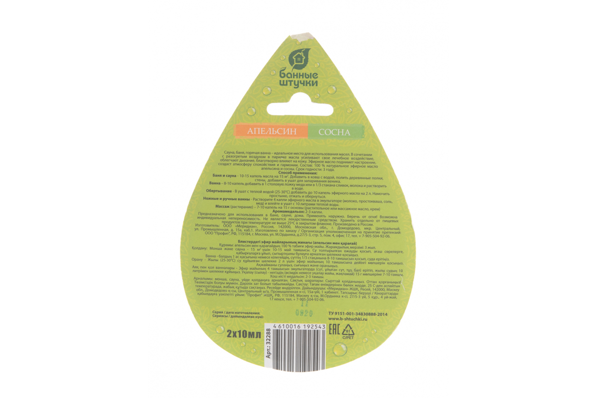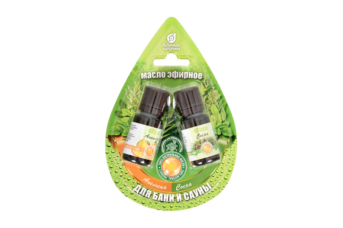 Набор эфирных масел Банные Штучки апельсин и сосна, 2 масла по 10 мл в блистере в форме капли 32288 используются в бане, в сауне или в ванной.