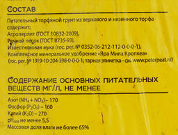 - Состав смесь верхового и низинного торфов с преобладанием низинного торфа; агроперлит; речной песок; известняковая мука; комплексное минеральное удобрение «Яра Мила Кропкеа»
