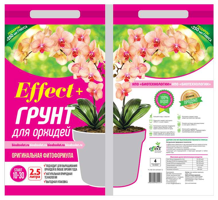 - Способ применения осторожно извлечь орхидею из старого горшка, удалить остатки старого грунта; осмотреть корни, удалить ножницами все сухие или сгнившие корни; место среза необходимо обработать бактерицидным средством или толченым активированным углем; все срезы также обрабатываются бактерицидными препаратами; обработать ФИТОСПОРИНОМ по инструкции; положить на дно горшка 1-2 слоя отборной коры; расположить растение посередине горшка, таким образом, чтобы корни растения оказались ниже верхнего края горшка; по желанию - смешать отборную кору с гумусом; аккуратно подсыпать оставшийся грунт для орхидей «Effect+ EffectPlus ЭффектПлюс» вокруг корней, не оставляя пустот; сверху грунта положить мох и увлажнить его