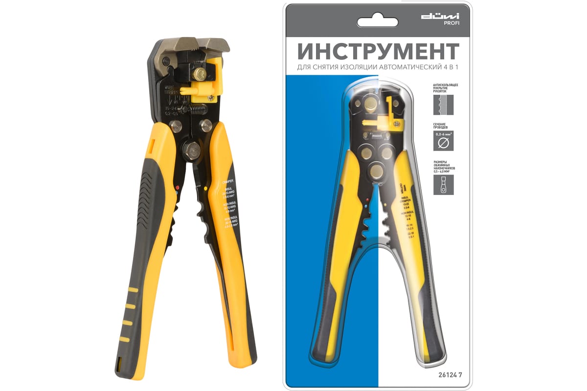 Инструмент для снятия изоляции duwi автоматический WS-04 PROFI 26124 7 используется для зачистки и обрезки проводов сечением от 0.2 до 6.0 мм² и снятия оболочки с плоских кабелей ВВГ-П, ПУНП.