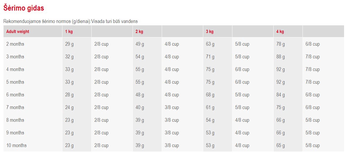 Nurodoma, kokio dydžio (vadovaujantis svoriu) gyvūnui tinka maistas. Maistas taip pat skirstomas ir pagal veisles.Mažiems šunims