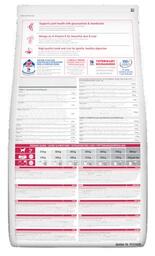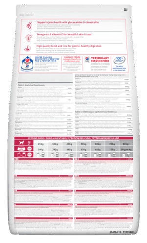 - Sudėtis Kukurūzai, ėrienos miltai, sojų miltai, kukurūzų glitimo miltai, gyvūniniai riebalai, malti ryžiai, baltymų hidrolizatas, augalinis aliejus, linų sėmenys, mineralai, kremzlės hidrolizatas (chondroitino sulfato šaltinis), vėžiagyvių lukštų hidrolizatas (gliukozamino šaltinis).