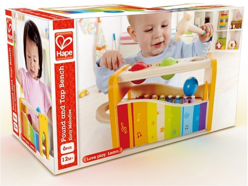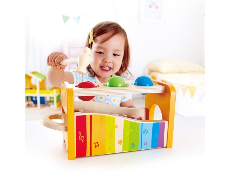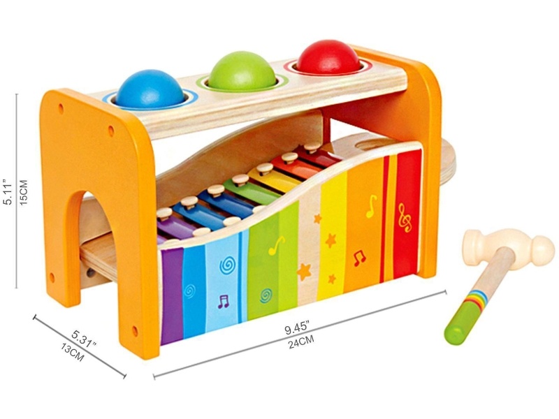 • Особенности игрушка имеет 2 яруса: стучалка и ксилофон; по шарикам нужно стучать деревянным молотком; выпадающие шарики стучалки звонко скатываются по клавишам ксилофона; каждый шарик издает разный звук; игрушка стимулирует изучать музыку; размер: 24х14х15