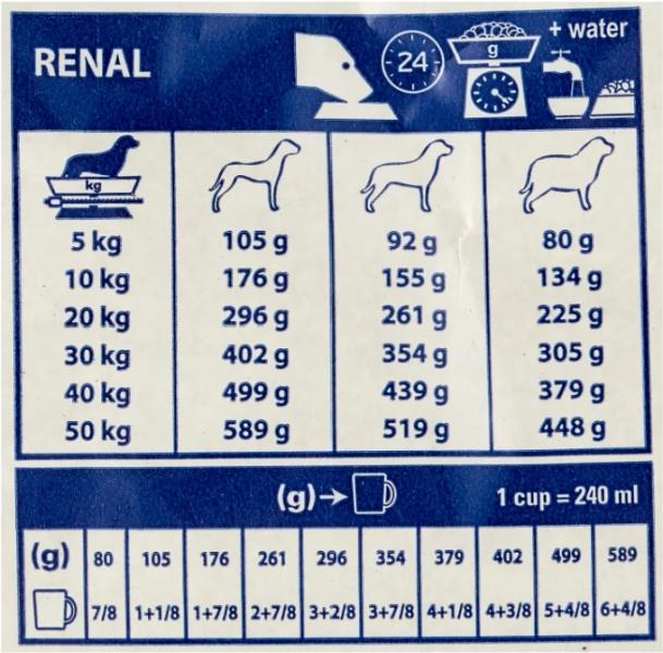 - Особенности продукты отличаются низким содержанием фосфора, содержат комплекс антиоксидантов, жирные кислоты ЕРА и DHA, высокое качество и адаптированное содержание белков способствуют снижению нагрузки на почки, ХПН может привести к метаболическому ацидозу, поэтому в состав продуктов входят подщелачивающие вещества, специально разработанный ароматический профиль помогает удовлетворить особые вкусовые предпочтения собаки