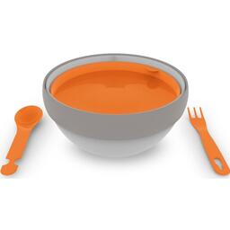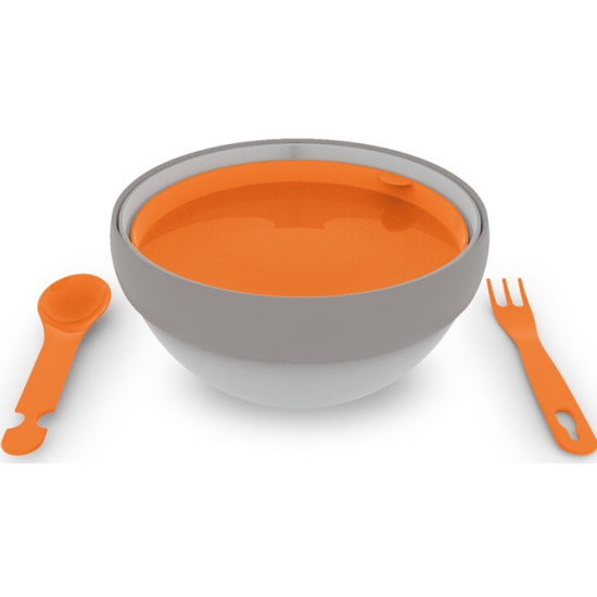 Он состоит из двух герметичных и вместительных чаш с крышкой, между которыми помещаются столовые приборы. Небольшая третья чаша сверху предназначена для соусов и приправ. При желании пластиковые вилка и ложка соединяются в удобные щипцы для салата.