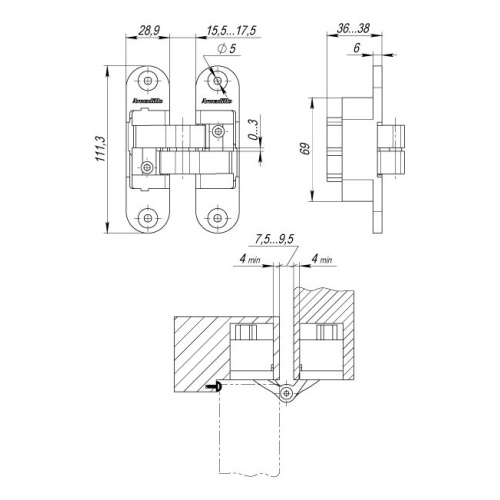 Петли Armadillo 3D-ACH - стильный и современный продукт. Невидимы на закрытой двери и обеспечивают угол открывания до 180 градусов. Бесшумны и плавны в работе за счёт нейлоновых вставок на подвижной части конструкции. Легко регулируются в трех плоскостях уже после завершения монтажа.Петля скрытой установки Architect 3D-ACH 60 AB Бронза ЛЕВАЯ предназначена для скрытой установки в межкомнатные двери без четверти с левым открыванием полотна. Рассчитана на нагрузку не более 60 кг при установке двух петель. Идеально сочетается с фурнитурой Armadillo серий LD и SQ в аналогичных цветах.