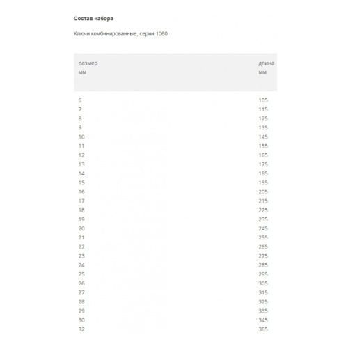 Комплектация данного набора включает ключи всех размерностей от 6 мм до 32 мм без пропусков редко встречающихся размеров. Удобное размещение ключей в чехле - каждый ключ в своей ячейке под соответствующим размерности номером. Разместив набор на рабочем месте – на стене, инструментальном стенде или верстаке, вы всегда будете иметь возможность выбрать тот ключ, который необходим в данный момент.