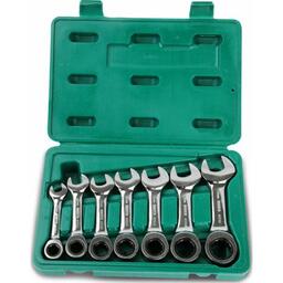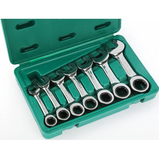 Ключи метрические комбинированные, укороченные, с трещоточным механизмом: Размеры (мм): 10,12,13,14,15,17,19. Преимуществом любого набора марки SATA является то, что любую его составляющую вы можете приобрести отдельно.