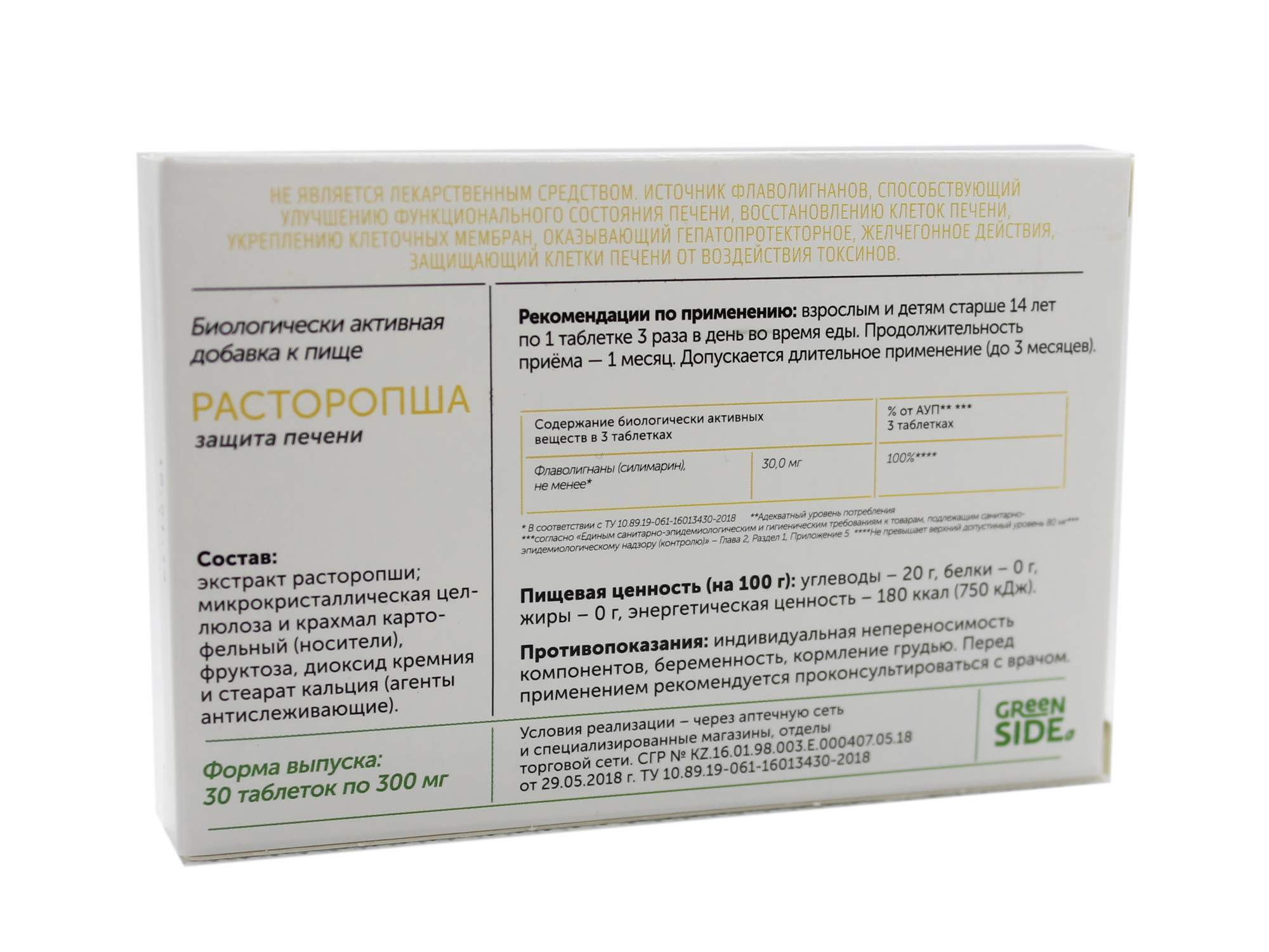 - Состав Экстракт расторопши; микрокристаллическая целлюлоза и крахмал картофельный (носители), фруктоза, диоксид кремния и стеарат кальция (агенты антислеживающие)