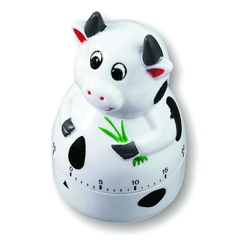 Кухонный механический таймер TFA 38.1007 выполнен в форме коровки, поэтому прекрасно вписывается в интерьер. Прибор можно установить на удобное время отсчета, на лицевой части корпуса проглядываются цифры равные минутам (5,15,30,60). Устройство удобно фиксируется на столе и по завершению отсчета автоматически отключается.