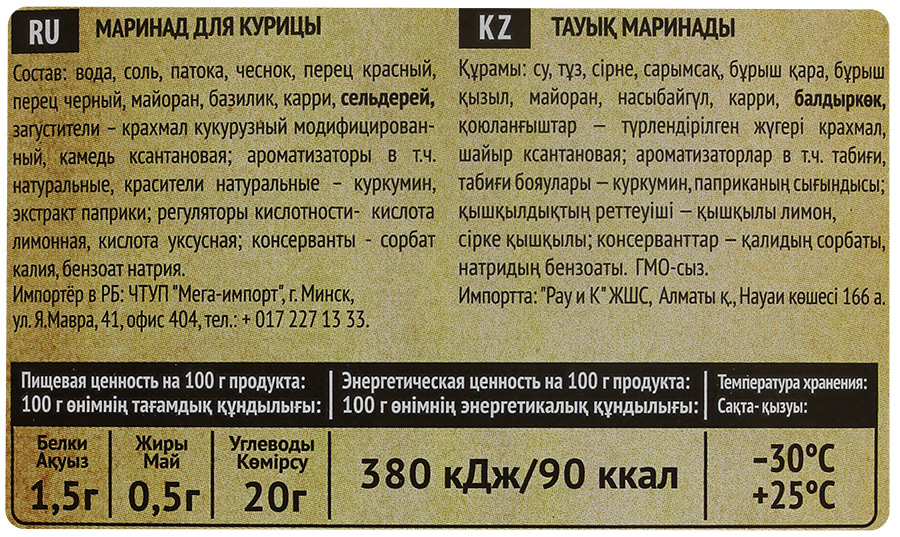 - Состав вода, соль, патока, чеснок, перец красный, перец черный, майоран, базилик, карри, сельдерей, загустители - крахмал кукурузный модифицированный, камедь ксантановая; ароматизаторы в т.ч. натуральные, красители натуральные - куркумин, экстракт паприки; регуляторы кислотности - кислота лимонная, кислота уксусная; консерванты - сорбат калия, бензоат натрия