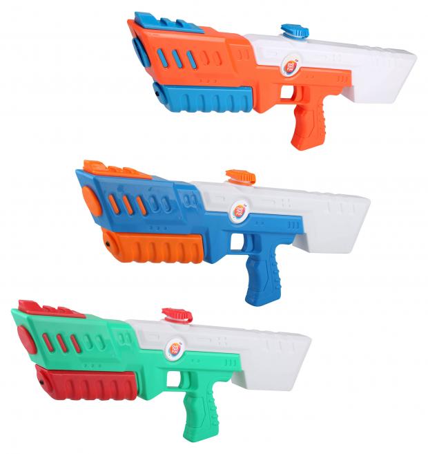 Водяной пистолет в ассортименте 3 цвета синий, зеленый, оранжевый. Размер пистолета 45х4,5х17,5 см. Размер упаковки 45,5х28х41 см. Батарея не требуется. Расстояние распыления 8 м. Емкость 600 мл. Возраст: 3+
