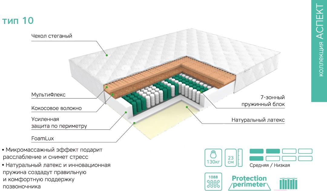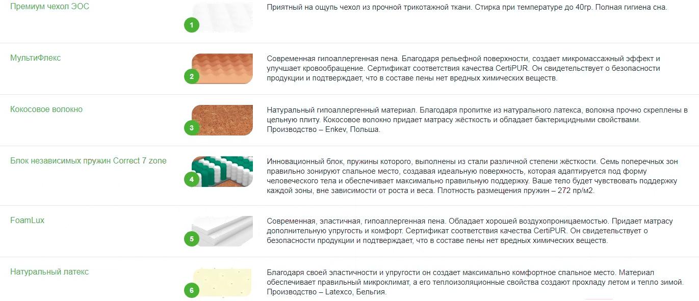 • Материалы кокосовая койра (1 слой), латекс (1 слой), пеноматериал (FoamLux) (1 слой)