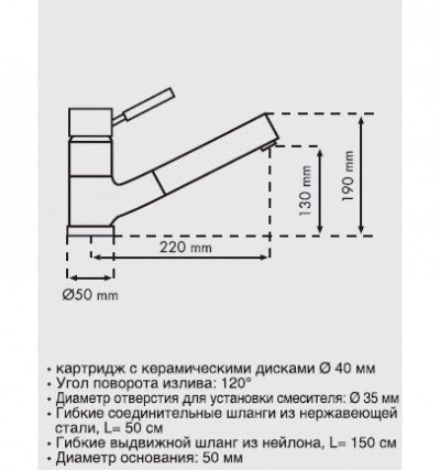 • Особенности выдвижной излив, поворотный излив, Керамический картридж...., аэратор, рычаг управления - сверху