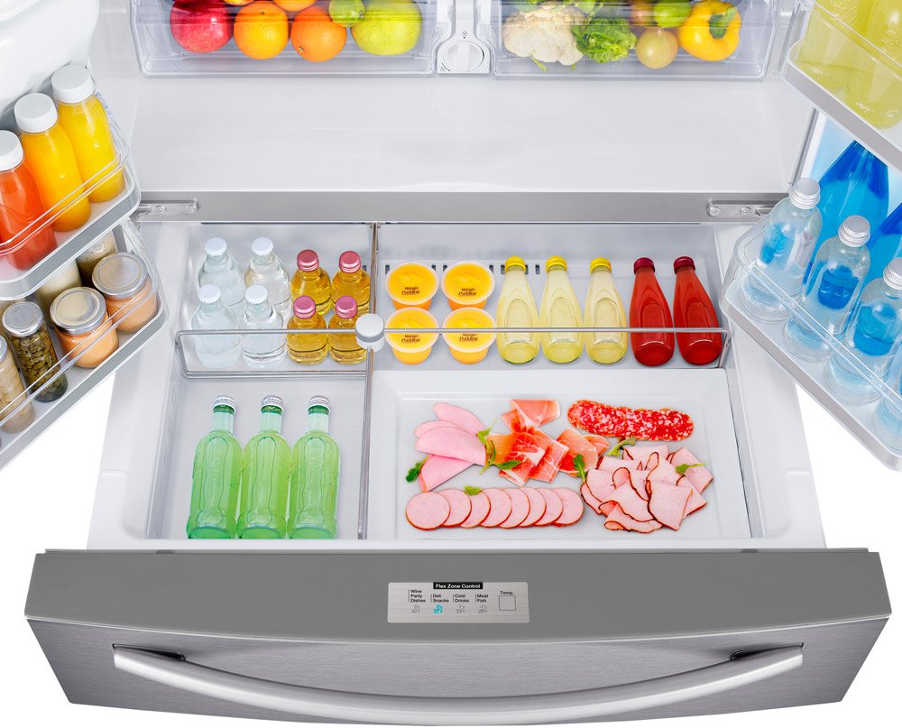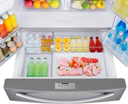 Отдельно стоящий, трехкамерный, компоновка морозильник внизу (Французская дверь), No Frost, класс энергопотребления A+, объем холодильной камеры 333 л, объем морозильной камеры 123 л, электронное управление, внешние ручки, дисплей.