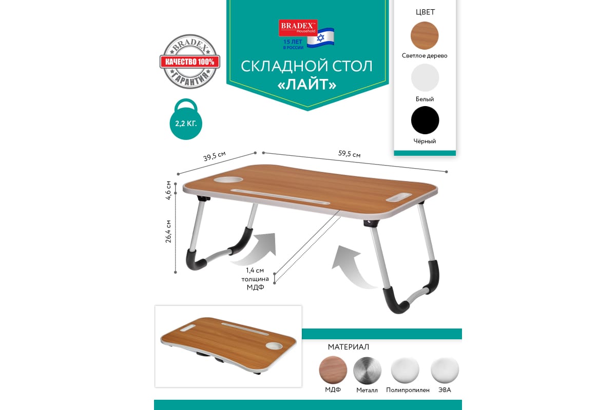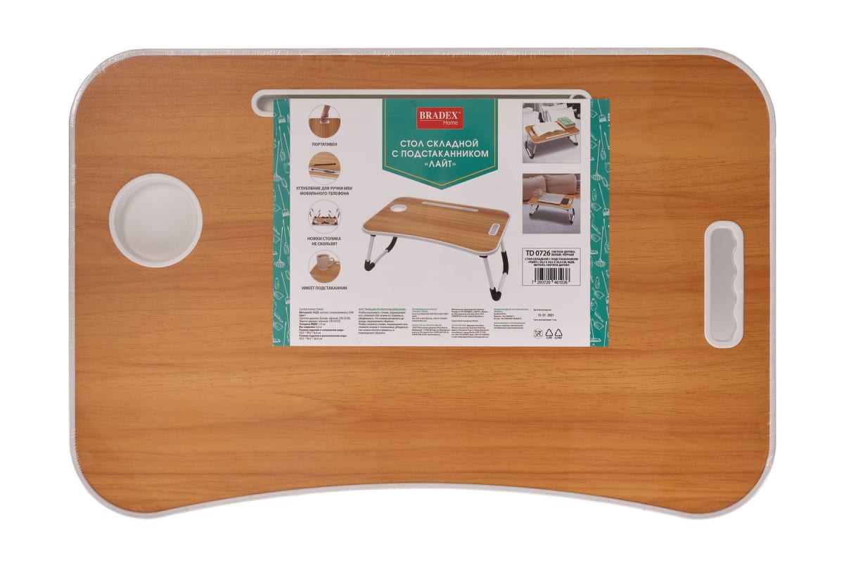 Складной стол с подстаканником BRADEX ЛАЙТ, 59.5x39.5x26.4 см, мдф, металл, светлое дерево, белый TD 0726