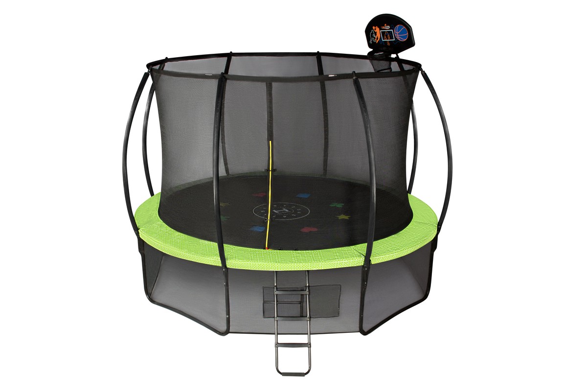 Коррозионностойкие пружины со специальным цветным покрытием, продлевающим срок службы;Три слоя защиты рамы (двойная оцинковка и слой порошковой краски);Высота батута 270 см;Дополнительно в комплекте: баскетбольное кольцо и мяч с насосом.