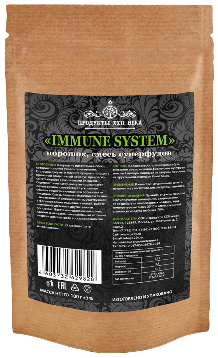 - Состав порошок мескита, порошок из бразильского ореха, молотая фиолетовая кукуруза, молотый имбирь, порошок из лукумы, порошок из фрукта нони, порошок Камю Камю