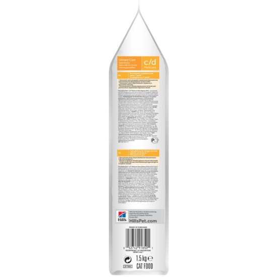 Hill's Prescription Diet c/d Multicare Urinary Care сухой диетический корм для кошек для поддержания здоровья мочевыводящих путей, с курицей 1,5 кгHill’s™ PrescriptionDiet™ Feline c/d™ Multicare помогает поддерживать здоровье нижних мочевыводящих путей у кошек и предотвращать риск рецидива образования струвитных уролитов после их растворения.Ключевые преимущества:Клинически доказано растворяет струвиты всего за 14 дней.Помогает снизить риск рецидива образования уролитовструвитов и оксалата кальция.С низким содержанием соли для поддержания здоровья почек.Подходит для длительного применения.Великолепный вкус, который понравится Вашей кошке.Витамин С не входит в состав рациона, поскольку является прекурсором оксалата.С низким содержанием соли для поддержания здоровья почек.Клинически доказано растворяет струвиты всего за 14 дней.Назначение:На начальном этапе у кошек с любым типом заболеваний нижних отделов мочевыводящих путей, в том числе кристаллурией и/или уролитиазом любого генеза, уретральными пробками и идиопатическим циститом кошек.Расстворение стерильных струвитных уролитовДля долговременного использования для кошек, склонных к:Образованию струвитных кристаллов и уролитов, кристаллов и уролитов кальция оксалата и кальция фосфата (снижение появления и частоты рецидивов).Формированию уретральных пробок (почти всегда вызванных кристаллами струвита или кальция фосфата).Не рекомендуется: Котятам.Беременным и кормящим кошкам.Кошкам, получающим вещества, закисляющие мочу.Не рекомендуется дополнительно давать вещества, закисляющие мочу. Необходимо контролировать состав мочи, чтобы гарантировать поддержание необходимого значения рН, при необходимости – исключить инфекцию мочевыводящихпутей.Перевод на данный рацион: Пробуете этот рацион впервые? Постепенно в течение 7 дней переводите животное на новый рацион, увеличивая его содержание по отношению к прежнему. Обеспечьте питомца свободным доступом к свежей воде.Рекомендации по кормлению: Монодиета. Не требует дополнений. Перед началом применения и о длительности кормления проконсультируйтесь с ветеринарным врачом. Суточная норма кормления указана на упаковке и должна быть рассчитана в соответствии с размером животного, чтобы поддерживать оптимальный вес. Суточную норму можно разделить на 2 и более кормлений в день.Ингредиенты: Курица: Размолотый рис, мука из мяса курицы (32%) и индейки, пшеница, мука из кукурузного глютена, животный жир, соевое масло, минералы, гидролизат белка, рыбий жир, витамины, таурин, микроэлементы и бета-каротин. Натуральные антиоксиданты (смесь токоферолов). Анализ: Белок 32,2%, Жир 15,5%, Омега-3 жирные кислоты 0,68%, Клетчатка 0,9%, Зола 5,1%, Кальций 0,74%, Фосфор 0,63%, Натрий 0,36%, Калий 0,63%, Хлориды 0,73%, Сера 0,69%, Магний 0,06%; на кг: Витамин E 600мг, Бета-каротин 1,5мг, Витамин В6 26мг, Цитрат калия 2г.Добавки на кг: E672 (Витамин A) 24170МЕ, E671 (Витамин D3) 1430МЕ, E1 (Железо) 154мг, E2 (Йод) 1,5мг, E4 (Медь) 19,6мг, E5 (Марганец) 6,8мг, E6 (Цинк) 131мг, E8 (Селен) 0,3мг, с натуральным антиоксидантом.Калорийность (в рационе): Ккал/100г: 387Условия хранения: Избегать попадания влаги. Хранить в сухом, прохладном месте, недоступном для детей и домашних животных. Открытый корм рекомендуется пересыпать в контейнер для хранения сухих кормов с плотно прилегающей крышкой.