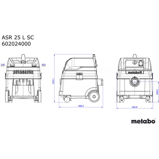 Пылесос промышленный Metabo ASR 25 L SC (602024000)Пылесос для влажной/сухой уборки, с промышленным допускомИдеальное решение для мобильного использования благодаря малому весу и компактной конструкцииДля обеспечения вытяжки от электроинструментов и очистки стройплощадки, мастерской и т. д.Розетка для электроинструмента с целью обеспечения автоматического включения/отключения пылесосаSelfClean: полуавтоматическая функция самоочистки фильтра в перерывах для последующей работыЗащита пользователя: сертификация согласно стандарту ЕС по защите от пыли класса LАвтоматическое отключение во время влажной уборки при достижении максимального уровня заполнения бакаАвтоматика выбега для полного опорожнения всасывающего шлангаАнтистатическое оснащение предотвращает образование статического заряда при использовании соответствующих принадлежностейВозможность намотки кабеляПрактичное отделение для принадлежностей и поверхность для храненияСистема хранения и транспортировки: подсоединение MetaLoc и пылесоса к Metadepot (принадлежность)Два фильтрующих картриджа из полиэфира с большой поверхностью фильтров обеспечивают неизменно высокую мощность всасывания