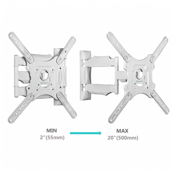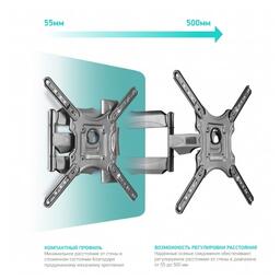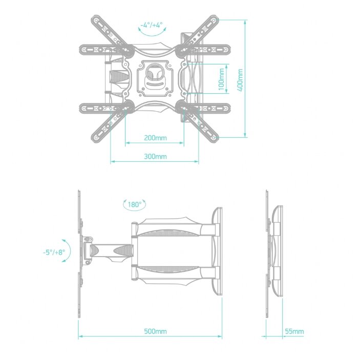 • Дополнительная информация угол наклона: -5° - +8°; угол поворота: 180°; вылет от стены: 55-500 мм; корректировка экрана по горизонтали -4°/+4°; материал: холоднокатаная сталь (SPCC class)