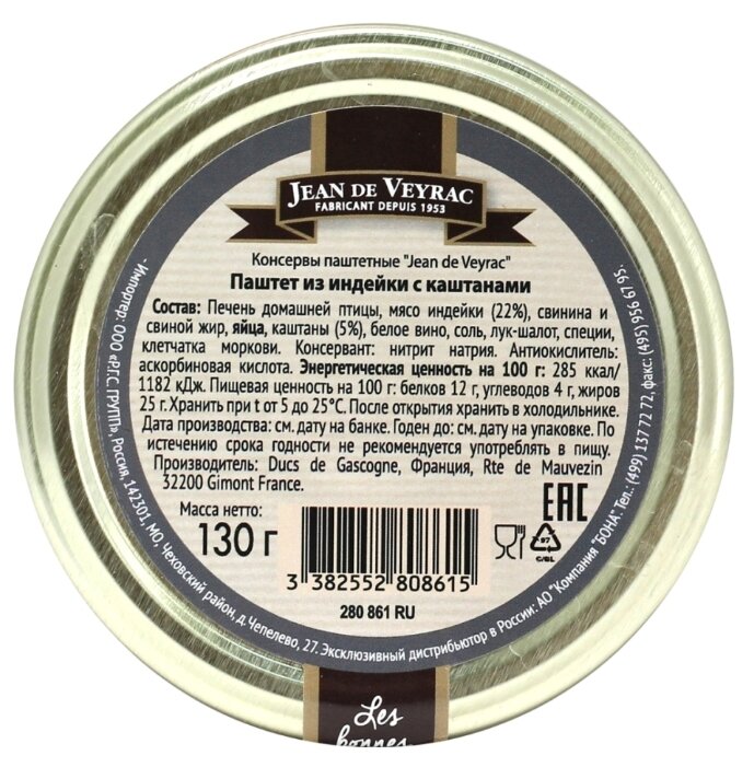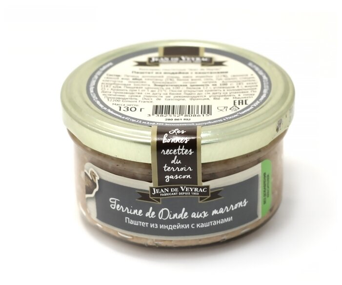 - Состав мясо индейки (22%), свинина, печень домашней птицы, свиной жир, каштаны (5%), яйца, белое вино, клетчатка моркови, соль, лук-шалот, специи