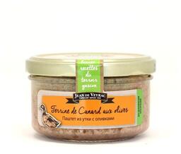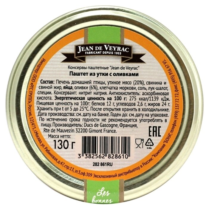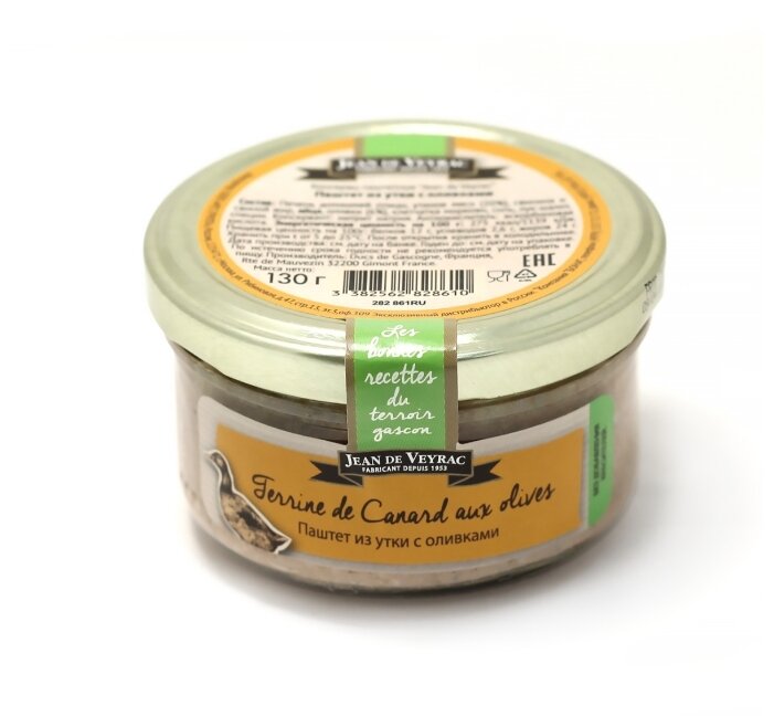 - Состав печень домашней птицы, утиное мясо (20%), свинина и свиной жир, яйца, оливки 6%, клетчатка моркови, соль, лук-шалот, специи; консервант: нитрит натрия; антиокислитель: аскорбиновая кислота