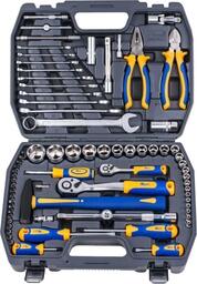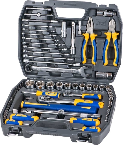 - Состав торцевые шестигранные головки; головки свечные: 16, 21 мм (1/2»); биты-вставки; комбинированные ключи (8/10/11/12/13/14/17/19/22 мм); отвертки (6,5*38; 6,5*100; ph2*100; ph2*38); молоток (300г); бокорезы 180 мм; плоскогубцы 180 мм; реверсивные ручные трещотки; удлинители; карданы шарнирные; переходники; вороток т-образный 1/4" 125 мм; держатель для бит-вставок 1/2"; рукоятка-удлинитель 1/4"