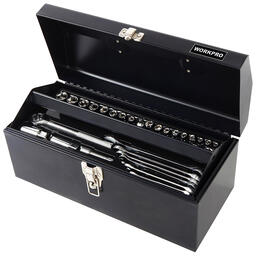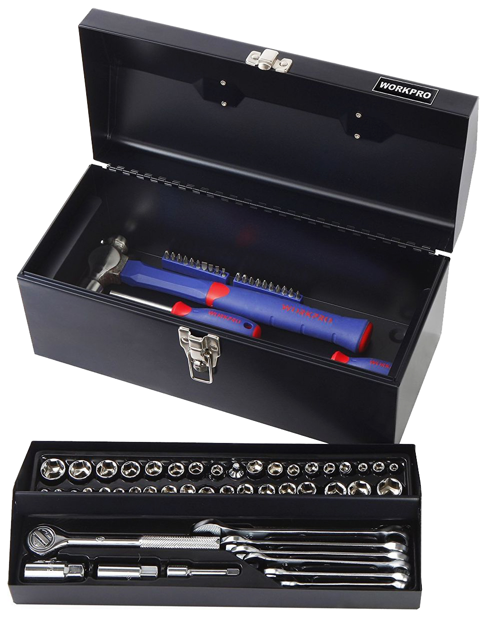 - Комплект поставки трещотка 3/8"; торцевые головки 3/8": 10; 11; 12; 13; 14; 15; 17; 19 мм; торцевые головки 3/8", дюйм: 5/16"; 3/8"; 7/16"; 1/2"; 9/16"; 5/8"; 11/16"; 3/4"; свечные головки 3/8": 16 мм; 21 мм (5/8"; 13/16"); удлинитель 3/8" 75 мм; переходник 3/8" х 1/4"; торцевые головки 1/4" метрические: 4; 5; 6; 7; 8; 9; 10; 11; 12; 13 мм; торцевые головки дюйм 1/4": 5/32"; 3/16"; 7/32"; 1/4"; 9/32"; 5/16"; 11/32"; 11/32"; 3/8"; 7/16"; 1/2"; молоток 450 г; пассатижи 180 мм; отвертка с храповым механизмом и магнитным держателем; биты - 20 шт; отвертки шлицевые с магнитным наконечником: 3/16"х3"; 1/4"х4"; филлипс: ph0x3"; ph2x4"; шестигранные ключи - 8шт; инструмент для снятия изоляции, обрезки и обжима кабеля; комбинированные ключи: 8; 10; 12; 14; 16; 18 мм; щетка проволочная; хомуты для кабеля - 20 шт; клеммы для кабеля - 55 шт; металлический ящик