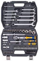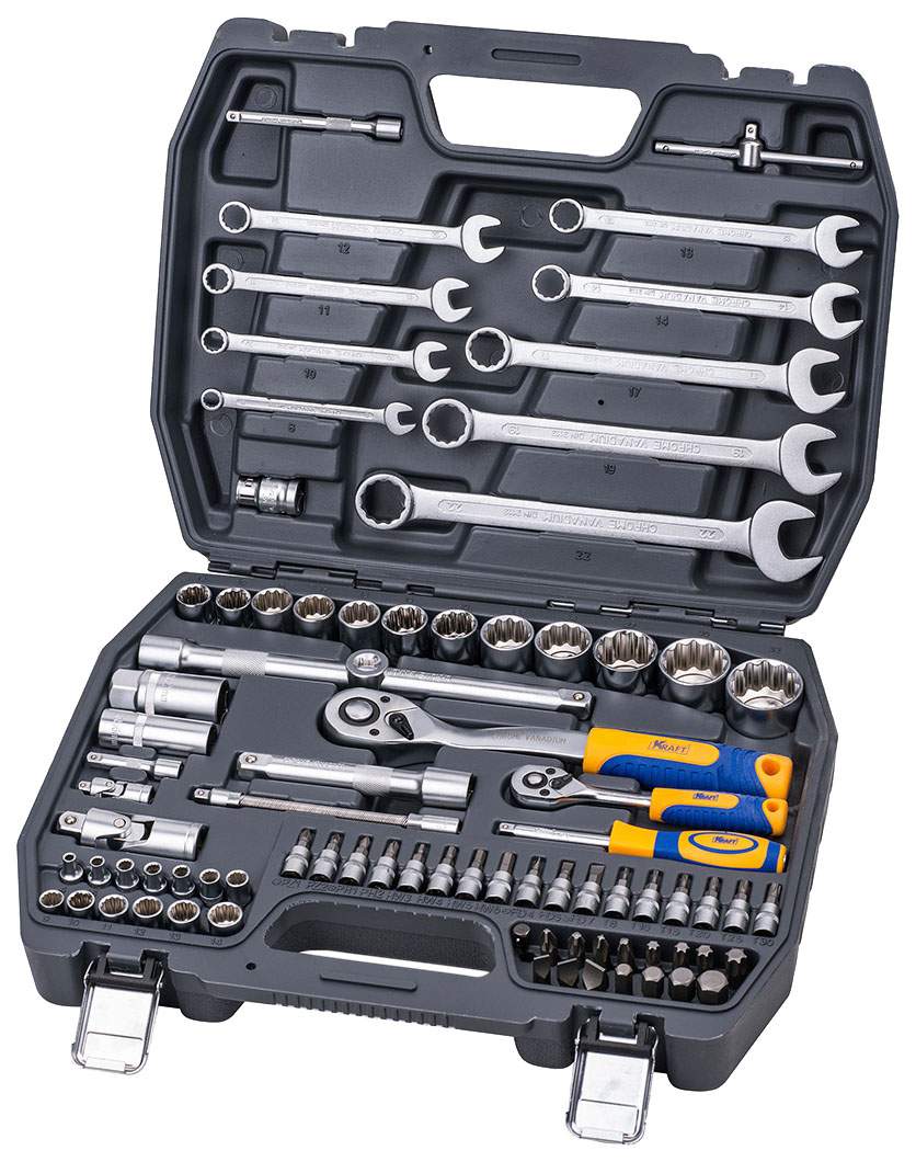 - Состав Торцевые головки 1/2' 12 граней (12шт.):14, 15, 16, 17, 18, 19, 20, 22, 24, 27, 30, 32, Удлинитель ¼'' (2шт.):50,100mm, Торцевые головки ¼'' с битами-вcтавками 6,35*25mm: pozi (2шт.):1, 2, Торцевые головки ¼'' с битами-вcтавками 6,35*25mm: Phillips (2шт.):1, 2, Торцевые головки ¼'' с битами-вcтавками 6,35*25mm: шлицевые (3шт.):4, 5,5, 7, Торцевые головки ¼'' с битами-вcтавками 6,35*25mm: шестигранные (4шт.):3, 4, 5, 6, Торцевые головки ¼'' с битами-вcтавками 6,35*25mm: TORX (6шт.):8, 10, 15, 20, 25, 30, Рукоятка-удлинитель ¼'', Рукоятка трещоточная с быстрым сбросом ¼'' 145mm (72 зубца, двухкомпонентная), Кардан шарнирный ¼'', Вороток Т-образный ¼'', Удлинитель гибкий ¼'' 145mm, Торцевые головки ¼'' 12 граней (13шт.):4, 4,5, ,5, 5,5, 6, 7, 8, 9, 10, 11, 12, 13, 14, Кардан шарнирный 1/2', Переходник ¼'', Биты-вставки 30mm: pozi (2шт.):3, 4, Биты-вставки 30mm: Phillips (2шт.):3, 4, Биты-вставки 30mm: шлицевые (3шт.):8, 10, 12, Биты-вставки 30mm: torx (4шт.):40, 45, 50, 55, Биты-вставки 30mm: шестигранные (4шт.):8, 10, 12, 14, Переходник ⅜" (F) х 1/2' (М), Держатель для бит-вставок 1/2', Рукоятка трещоточная с быстрым сбросом 1/2' 250mm (72 зубца, двухкомпонентная), Удлинитель 1/2' (2шт.):125,250mm, Торцевые головки свечные (2шт.):16,21, Ключи рожково-накидные (9шт.):8, 10, 11, 12, 13, 14, 17, 19, 22