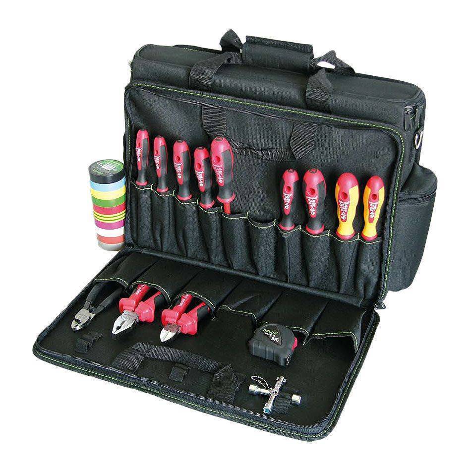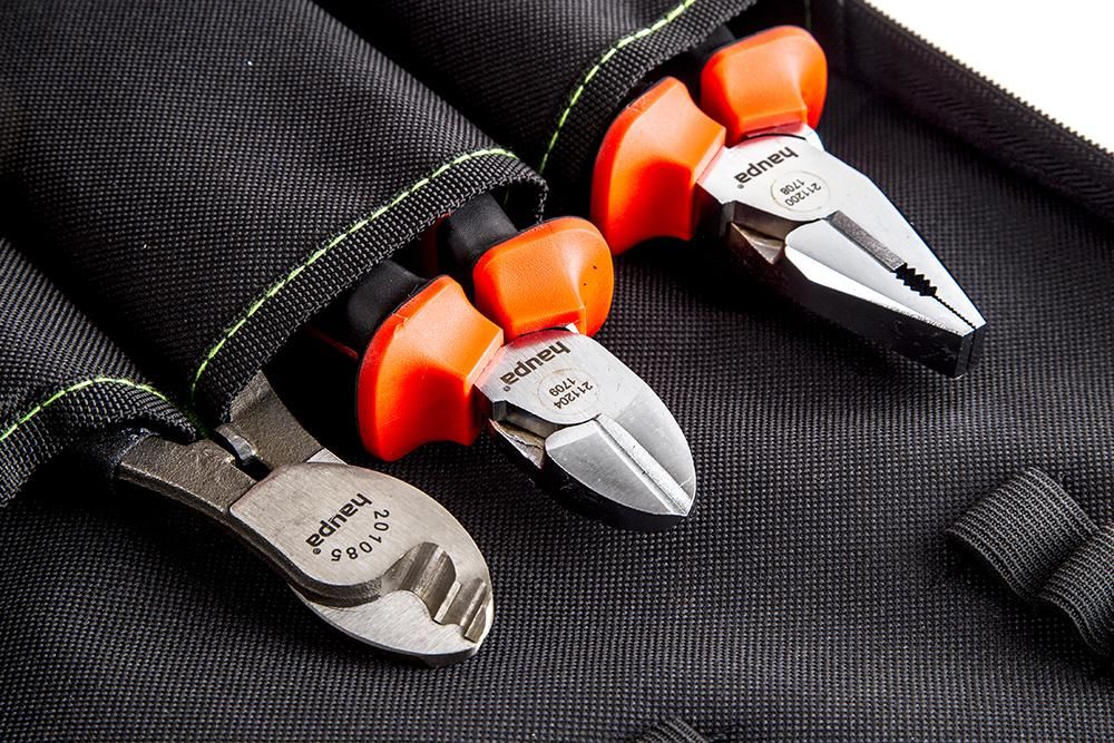 - Комплект поставки двухкомпонентные отвертки; электрическая изолента; кабелерез 160 мм; кусачки-бокорезы 165 мм; пассатижи 185 мм; измерительная лента 3 м; сумка