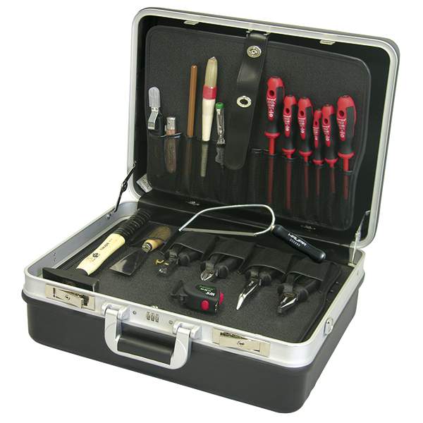 - Комплект поставки кейс; отвертки для электромонтера; итвертка с крестообразным шлицем PH; двухкомпонентные пассатижи 180 мм; двухкомпонентные боковые кусачки 160 мм; двухкомпонентные телефонные клещи 200 мм; двухкомпонентные клещи для снятия изоляции 160 мм; нож для резания кабеля диаметром 8-28 мм; нож для резания кабеля, однокомпонентный; слесарный молоток 300 г; компактная пила “PUK” с прочной ручкой; зубило для электромонтера 10 х 250 мм; индикатор напряжения 50 мм; деревянный складной метр 3 м; шпатель 40 мм; кисточка