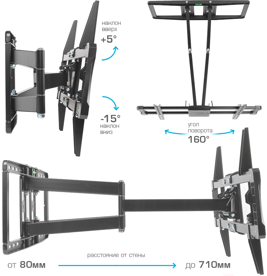 • Виды регулировок наклон (+2 -15°), поворот (160°), вращение (±5°)