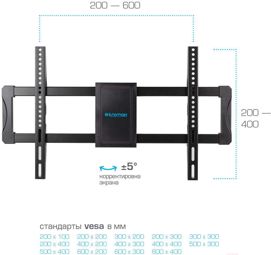 • Поддерживаемый стандарт VESA 200×200, 300×300, 400×400, 200×300, 200×400, 200×100, 400×200, 600×400, 300×200, 400×300, 600×300, 600×200